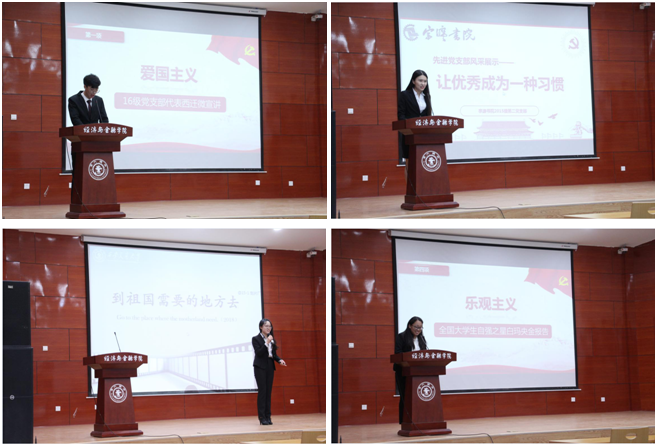 弘扬四面旗帜主题教育分别围绕爱国主义、集体主义、英雄主义和乐观主义展开分享。首先,16级党支部代表刘帅分享了支部同志本学期以来在大雁塔、小寨等地开展西迁微宣讲的经历,并在会上倾情宣讲,倡导广大党员同志践行“胸怀大局,无私奉献,弘扬传统,艰苦创业”的西迁精神,展现了新老交大人的爱国情怀;先进党支部代表15-2党支部进行了“让优秀成为一种习惯”支部风采展示,通过支部建设、党员教育、特色活动、宣传工作等方面的分享,让大家看到了一个充满凝聚力、战斗力和创造力的集体;而由15-1党支部自编自导自演的微电影《到祖国最需要的地方去》则展现了新时代交大学子的英雄主义情怀,观影过程中全场笑声和掌声不断,导演别出心裁的解说更是引发了在场同志深思;最后,中国大学生自强之星白玛央金分享了她在社会实践中的经历和体会,朴实幽默的语言中展示了一位自立自强、乐观奉献的雪域女孩形象,大家都为有这样一位身边宗濂人而骄傲。