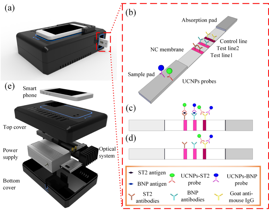 心力衰竭是心血管疾病的终末期,在诊断后的第一年引起约35%的死亡率,超过50%的患者在出院后6个月内重新入院。ST2和BNP的抗原是心衰及其进展的良好指标。但目前,分析这些生物标志物的水平需要经过培训的人员和精密的实验室设备,因此,在家中即时的心衰预警对预防不良心脏事件和降低再入院率至关重要,引起材料、机械设计、力学、生物医学等学科研究人员的广泛兴趣。 近日,西安交通大学仿生工程与生物力学中心的游民黎博士以第一作者身份在ACS nano(IF=13.334)上发表题为“Household Fluorescent Lateral Flow Strip Platform for Sensitive and Quantitative Prognosis of Heart Failure Using Dual-Color Upconversion Nanoparticles”的论文。论文旨在设计一个简单的测试,使医生和病人能够在办公室或家里进行相同的分析。文中开发了仅需要10微升血样的基于荧光的测试纸条。如果样品中存在ST2,则绿色点亮起,如果含有BNP,则蓝色点亮起。颜色强度随着浓度的增加而增加,这表明病人的心力衰竭可能会变得更糟。另外,相应的智能手机应用程序被开发,用以读取分析并将结果发送给医生,他们可以相应地调整患者的治疗。同时项目还测试了38例患有心力衰竭患者血清样品,验证了测试纸条的准确性和可重复性。该文章表后,被美国化学学会(American Chemical Society,ACS)重点报道。